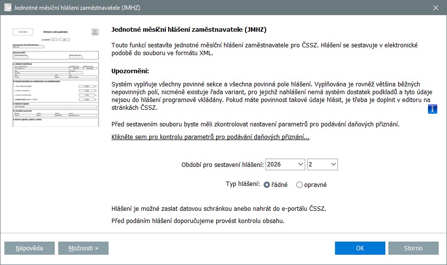 Během dubna se pak budou odesílat mzdová hlášení za měsíce 1 - 3 roku 2026. K tomuto se použije nový XML výstup z PROFITu - Jednotné měsíční hlášení zaměstnavatele (JMHZ).